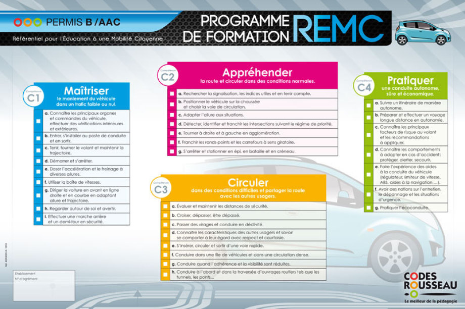 Depuis le 1 juillet 2014 le REMC vient remplacer le PNF (Programme National de Formation à la conduite) datant de 1989. Il a été mis en place par les pouvoirs publics pour lutter contre l’insécurité routière.